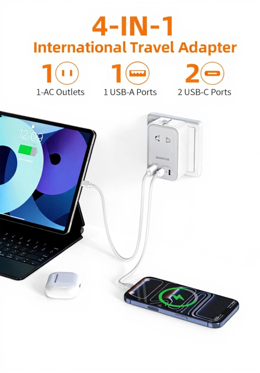 Cet adaptateur de voyage universel combine fonctionnalité et design compact. Équipé d’un port USB-A, deux ports USB-C PD 20 W et une prise AC, il permet de charger simultanément jusqu’à 4 appareils. Sa construction ultra-plate de seulement 3 cm d’épaisseur et ses broches rabattables en font un accessoire de voyage pratique et durable.