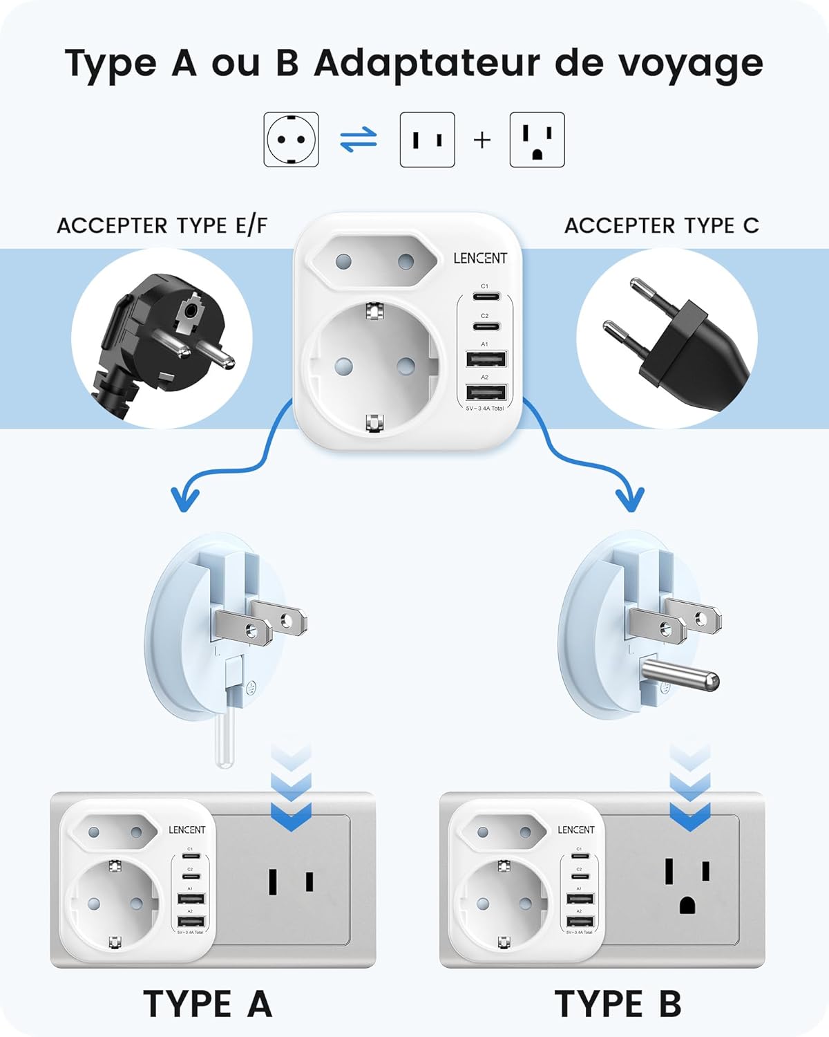 Adaptateur Prise USA LENCENT Type A et Type B avec USB-C