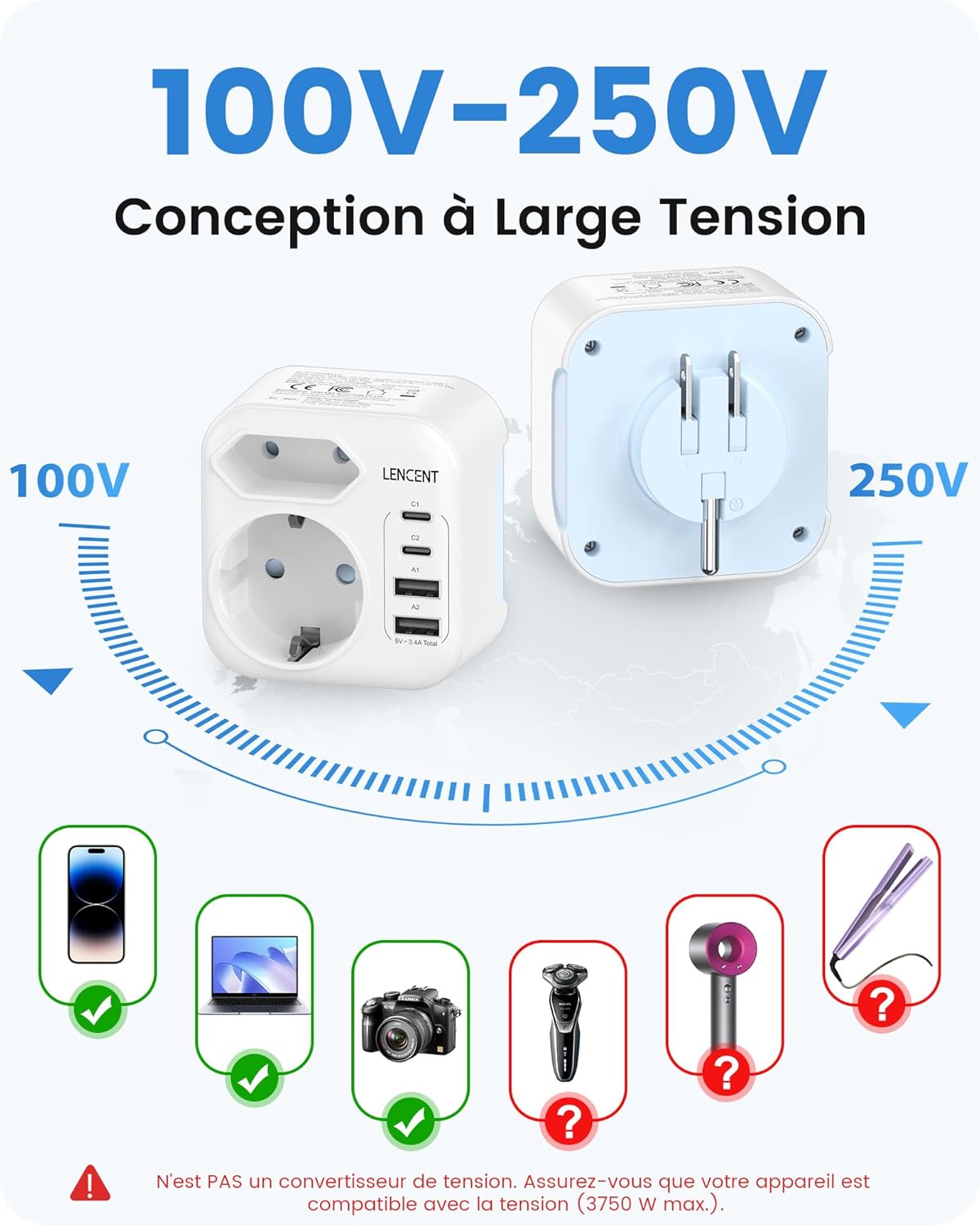 - Adaptation aux voltages 100V-250V pour appareils électroniques standards
