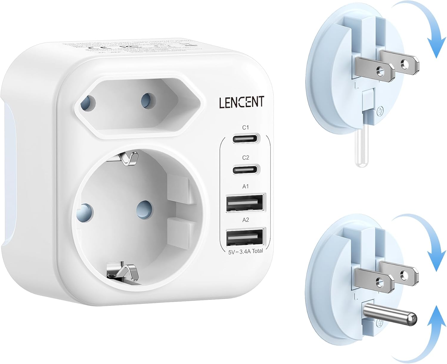 Cet adaptateur de voyage combine une prise Schuko, une prise EU, deux ports USB-C et deux ports USB-A. Conçu pour une utilisation internationale, il supporte une puissance maximale de 3750W et est repliable pour un encombrement minimal.